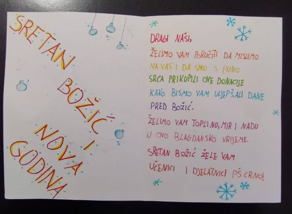 Od srca zahvaljujemo učenicima Medicinske škole Ante Kuzmanića u Zadru i učenicima Osnovne područne škole Crno koji su s velikom pažnjom, toplinom i osjetljivošću sudjelovali u božićnoj humanitarnoj akciji darivanja poklona za beskućnike smještene u prenoćištu u Zadru.